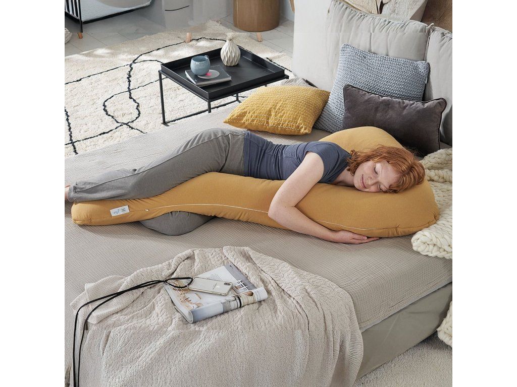Polštář je oblíben i jako kojící polštář pro maminky. Delší část si položí okolo trupu a pro miminko zůstává krátká část, která je dostatečně velká.